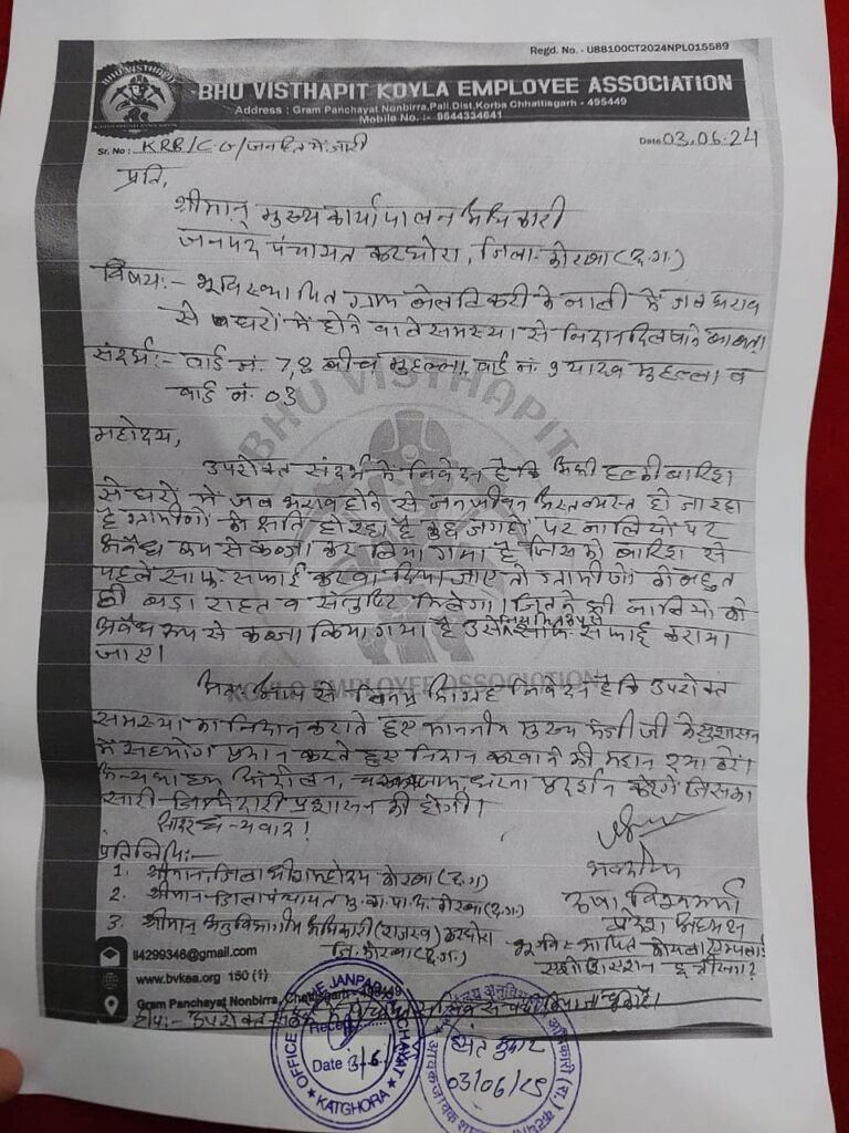 कोरबा। भूविस्थापित कोयला कर्मचारी संगठन प्रदेश अध्यक्ष ऊषा विश्वकर्मा ने जनपद पंचायत कटघोरा मुख्य कार्यपालन अधिकारी को दीपका गेवरा क्षेत्र के बेलटिकरी बसावट के विभिन्न वार्डों में जल भराव की समस्या को लेकर पत्र लिखा है।