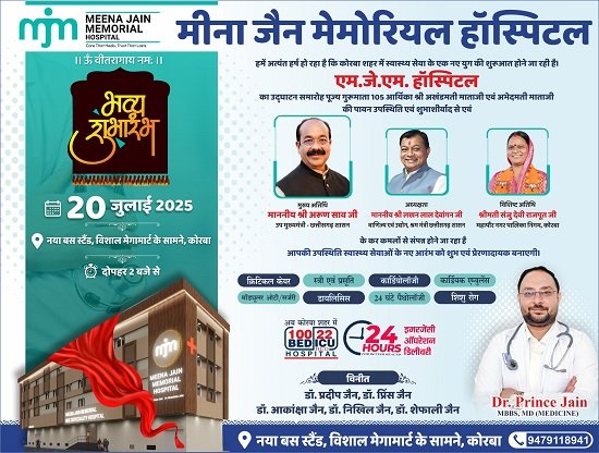 कोरबा। ट्रांसपोर्ट नगर, नया बस स्टैंड के पास, विशाल मेगामार्ट के सामने स्थित मीना जैन मेमोरियल हॉस्पिटल (एमजेएम) का शुभारंभ शहरवासियों के लिए चिकित्सा सुविधा के क्षेत्र में एक नई शुरुआत होगा। आधुनिक स्वास्थ्य सेवाओं से सुसज्जित यह मल्टी-स्पेशियलिटी हॉस्पिटल, न केवल शहर के बल्कि आसपास के ग्रामीण क्षेत्रों के लिए भी वरदान साबित होगा।