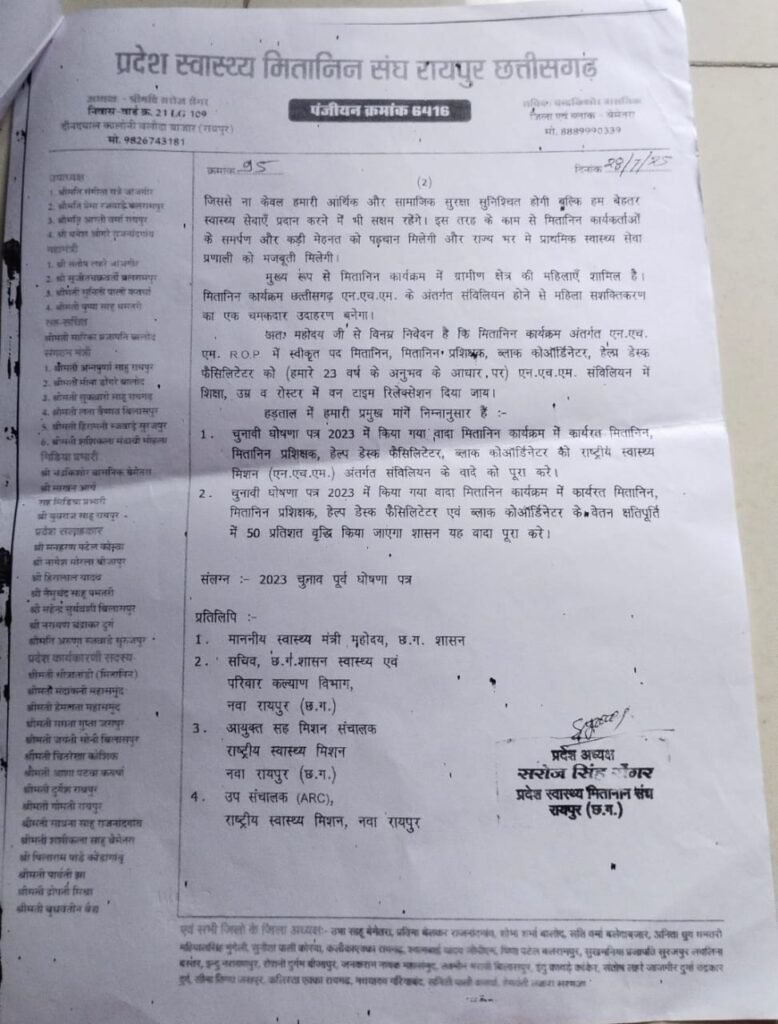 मितानिनों का आरोप है कि 2023 के विधानसभा चुनाव में “मोदी की गारंटी” के तहत भाजपा ने वादा किया था कि मितानिन, मितानिन प्रशिक्षक, हेल्प डेस्क फैसिलिटेटर एवं ब्लॉक कोऑर्डिनेटर को एनएचएम में शामिल किया जाएगा, उनके वेतन क्षतिपूर्ति में 50% वृद्धि होगी और ठेका प्रथा समाप्त की जाएगी। लेकिन सरकार बनने के दो साल बाद भी कोई ठोस कदम नहीं उठाया गया।