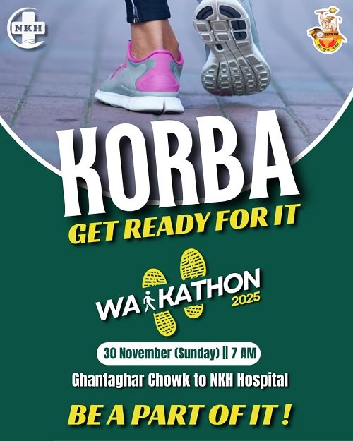 कोरबा । तेज़ रफ़्तार जिंदगी में लोगों को अपने स्वास्थ्य के प्रति जागरूक करने के उद्देश्य से एनकेएच हॉस्पिटल ग्रुप और बजरंग दल कोरबा द्वारा वॉकाथन 2025 का आयोजन 30 नवंबर को किया जायेगा। कार्यक्रम का शुभारंभ प्रातः 7 बजे घंटाघर चौक से होगा, जहाँ से प्रतिभागी पैदल चलते हुए न्यू कोरबा हॉस्पिटल पहुँचेंगे।